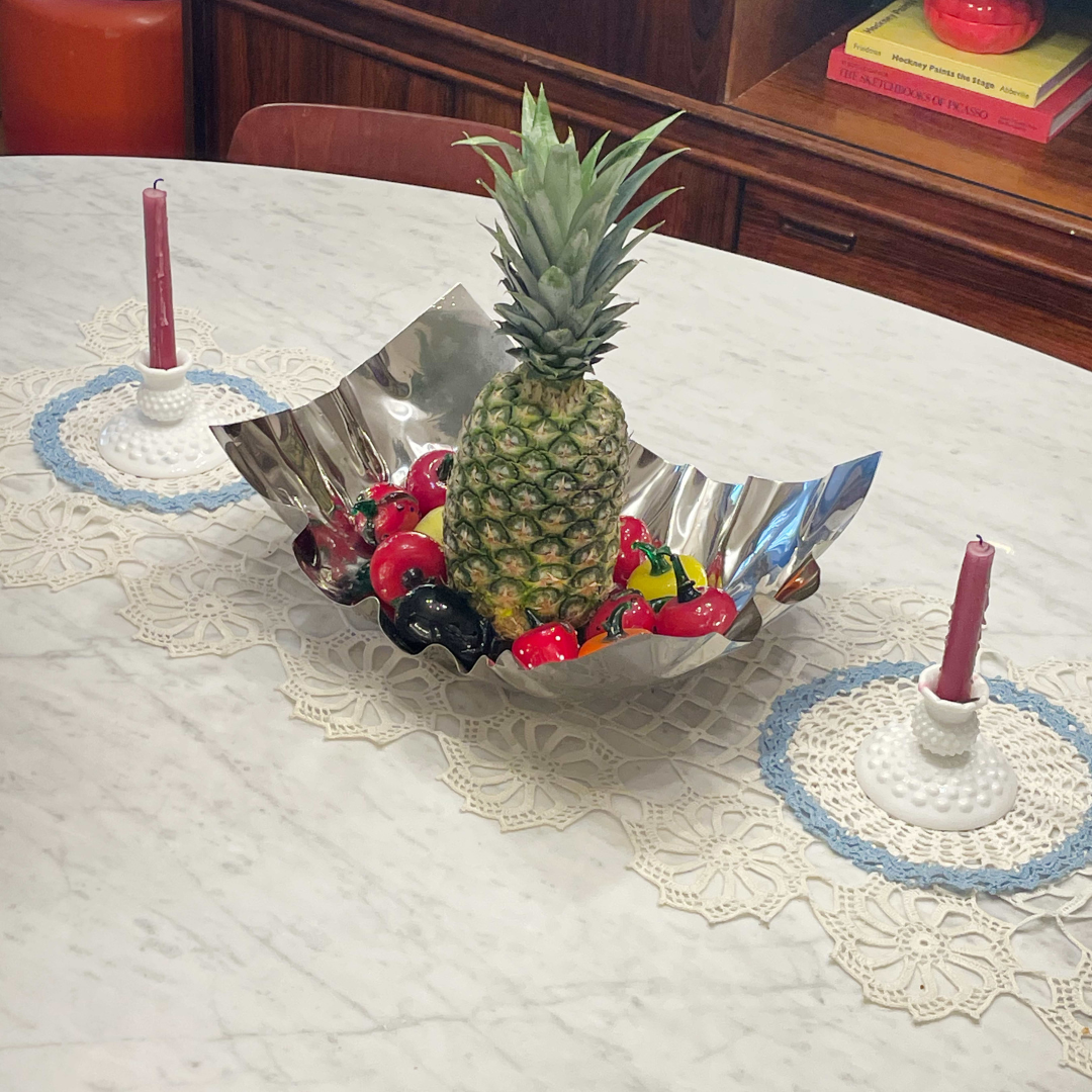 transform your dining experience with this charming crochet doily set. set of two doilies - white with bay blue center and trim.