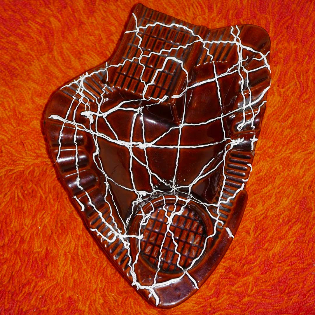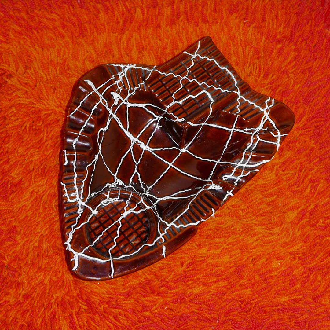 large vintage pottery catchall with hand dripped white detailing. we love this unique design, such a fun shape for any room!
