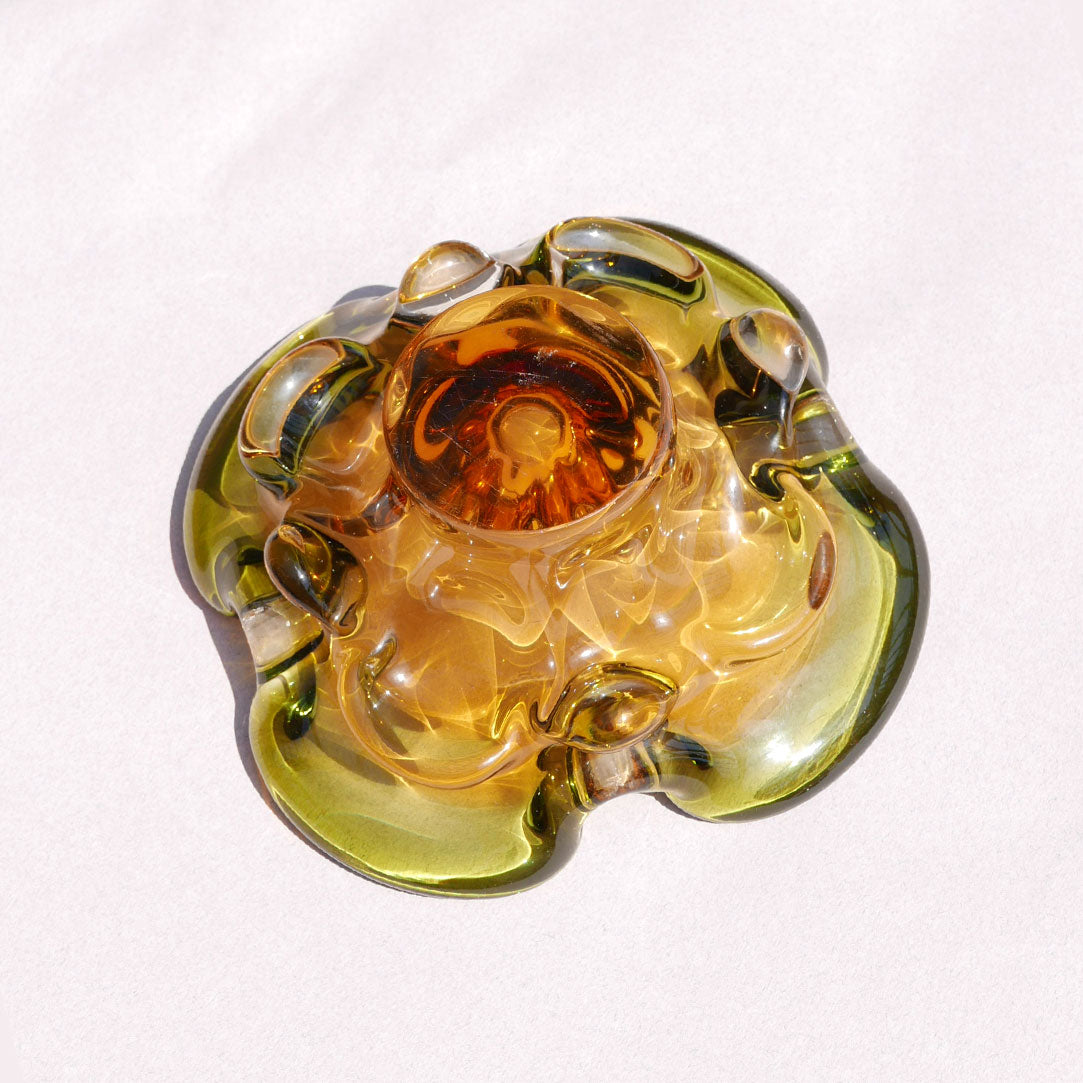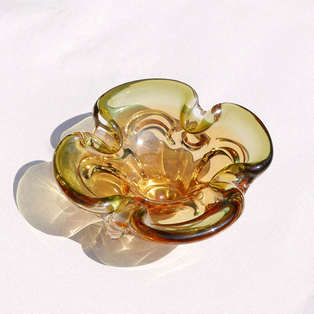 beautiful yellow handblown art glass dish with clear glass edges that resemble a four-leaf clover.