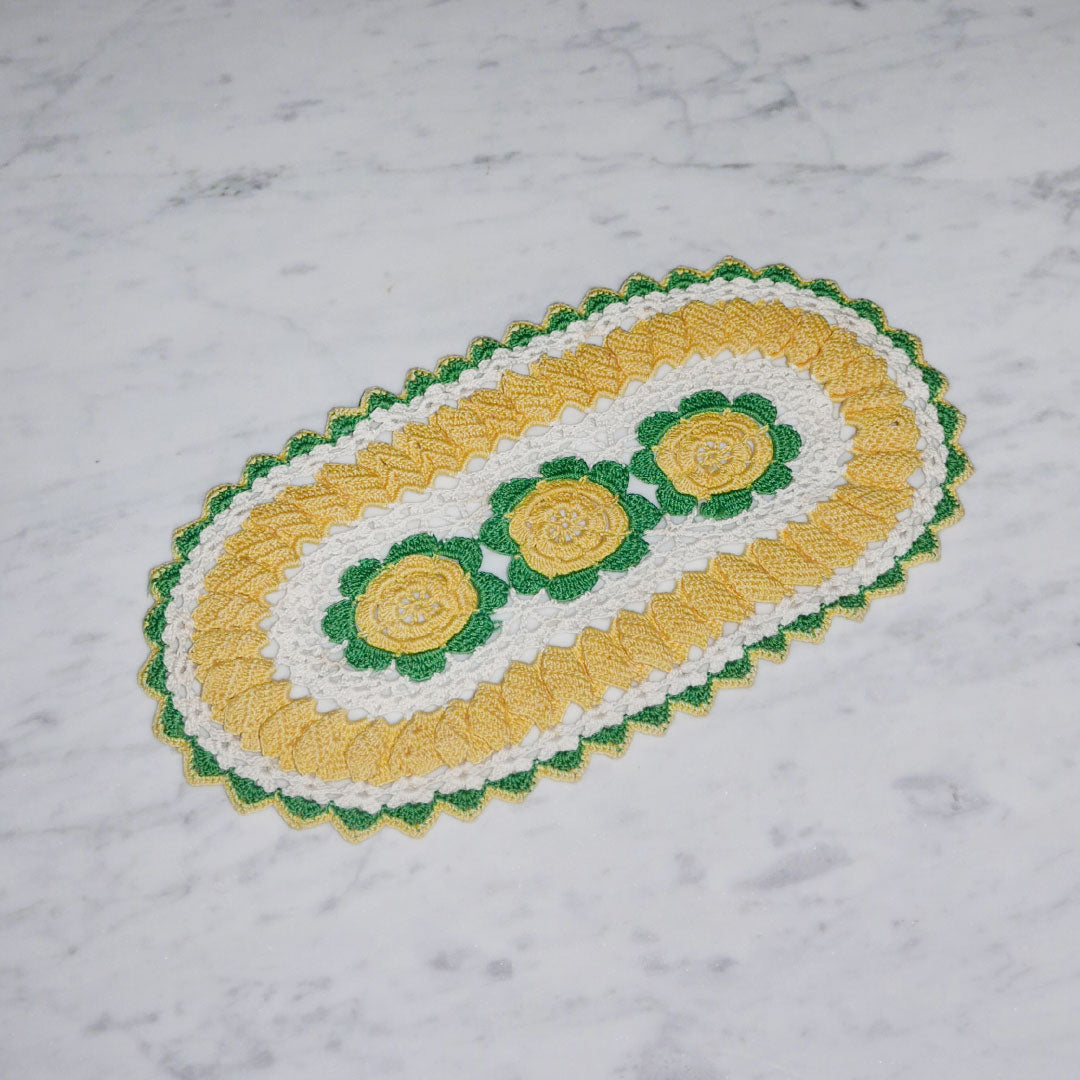 vintage white doily with green and sunny yellow trim. a wonderful accent for your holiday table.