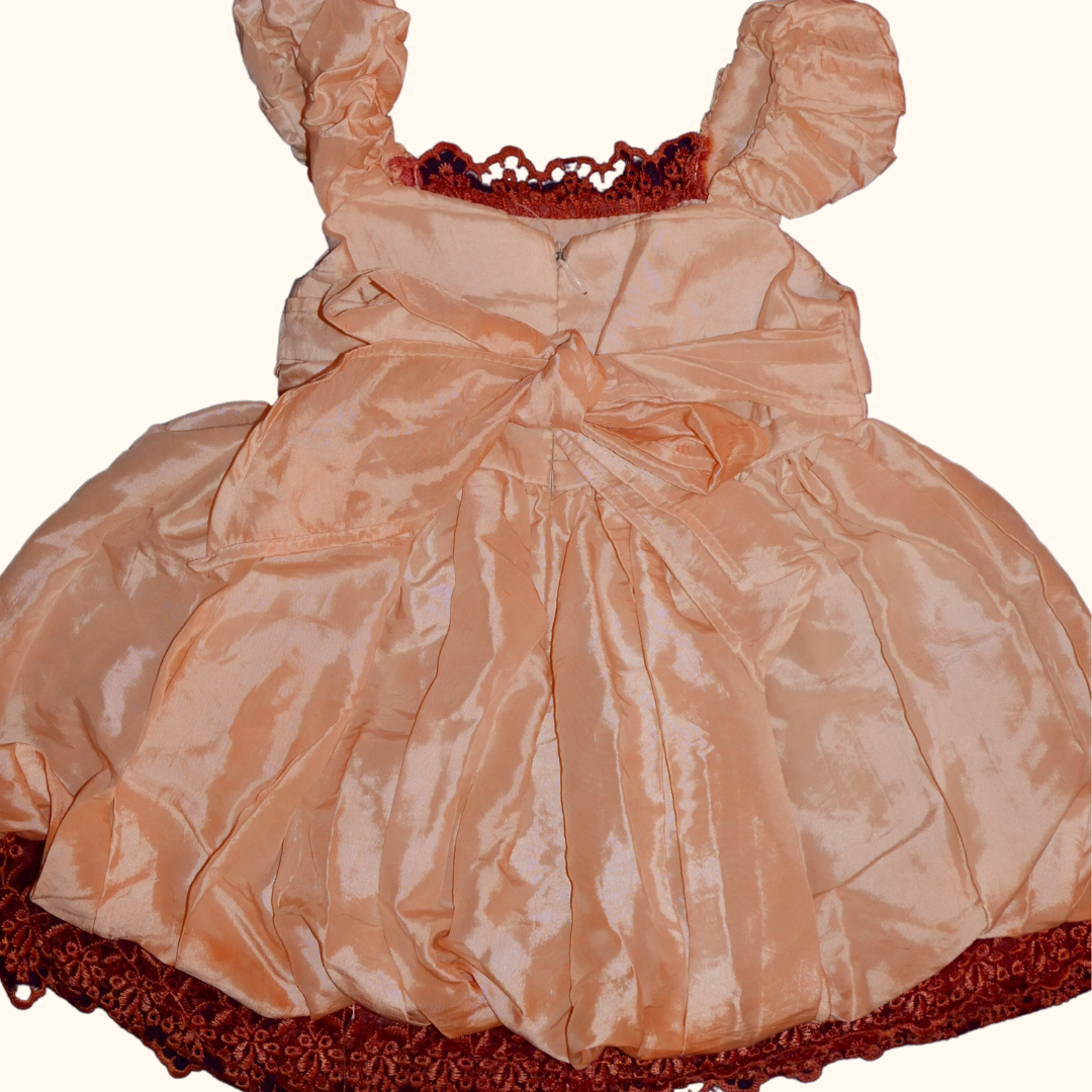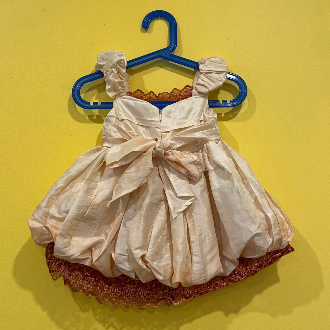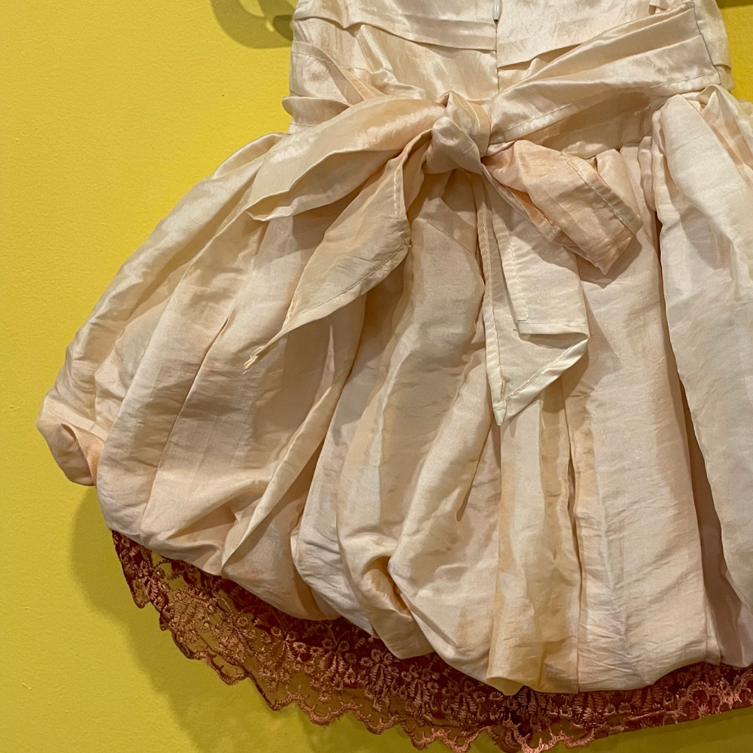 beautiful pink puffed dress with ruched front and burnt orange lace trim. zipper closer at the back with tied bow.