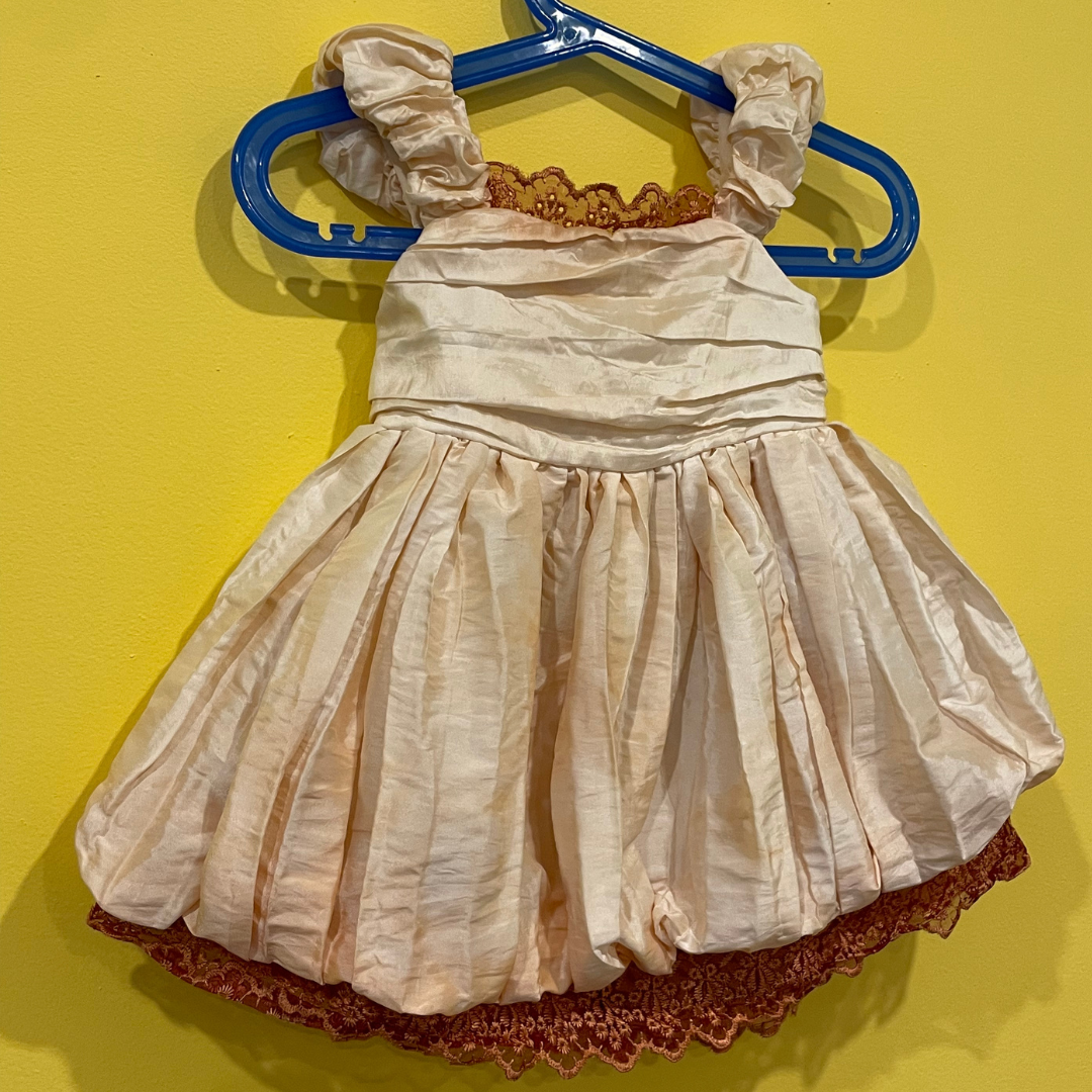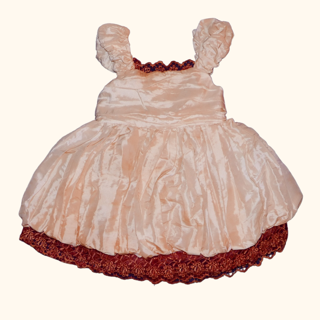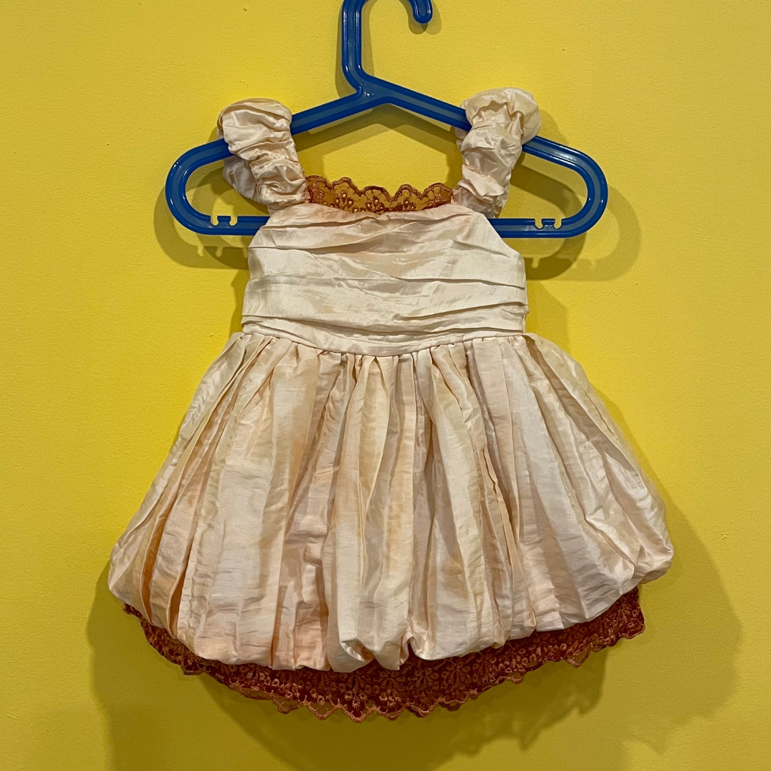 beautiful pink puffed dress with ruched front and burnt orange lace trim. zipper closer at the back with tied bow.