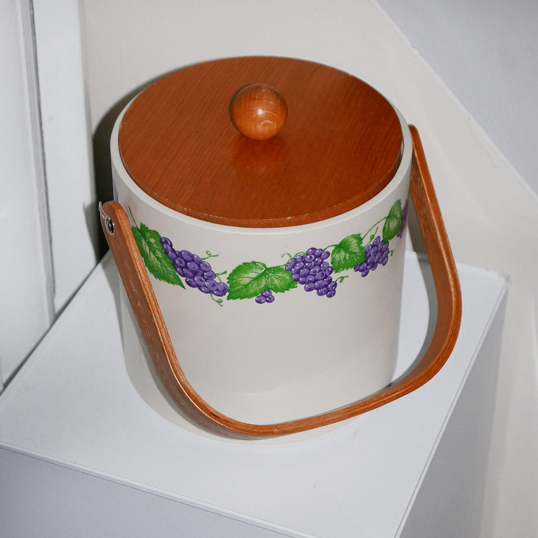 vintage 90s ice bucket with grape detailing. comes with metal serving tongs.