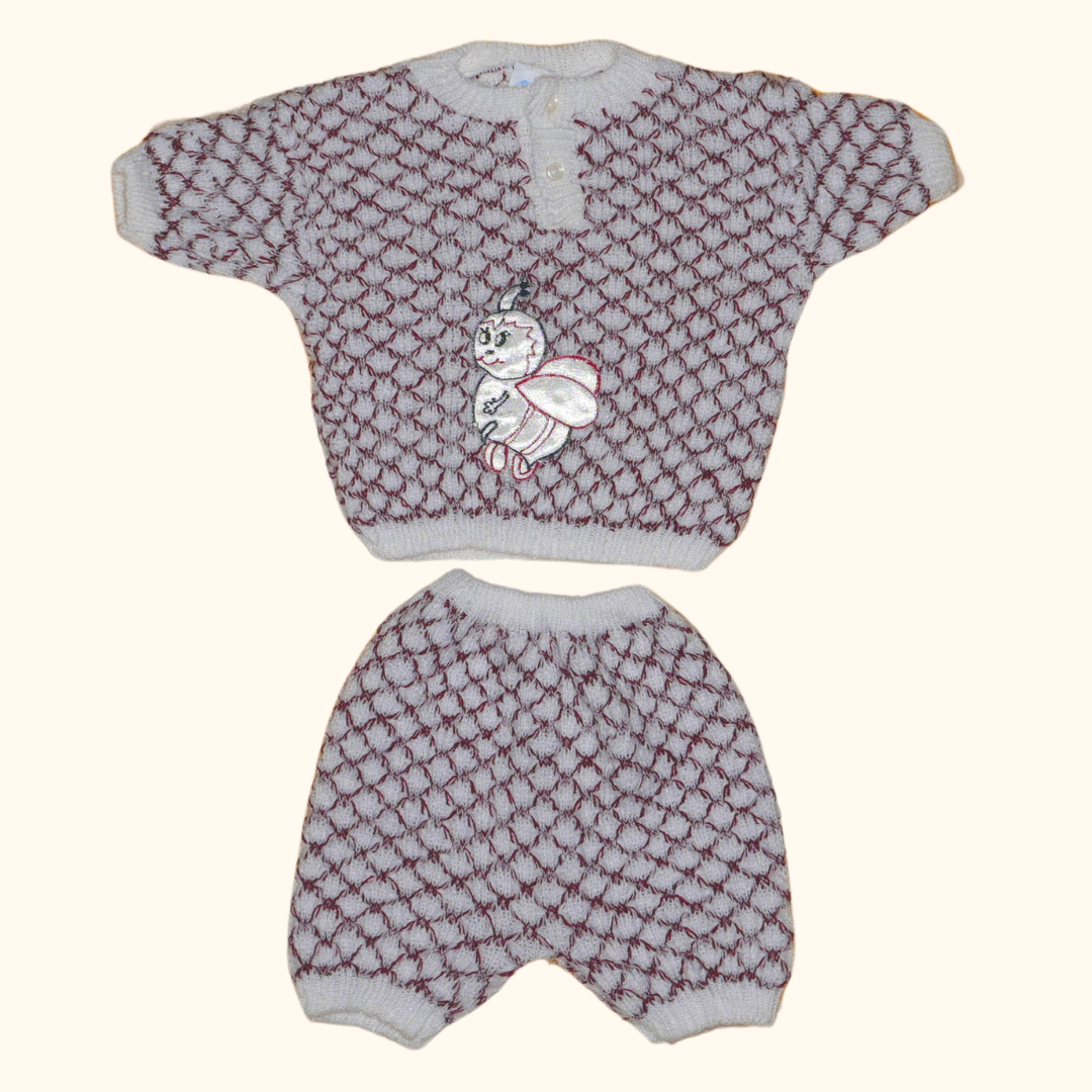 adorable white and burgundy bumble bee set with short sleeve sweater and bloomers. sweater has two buttons and bloomers are elasticized at the waist.