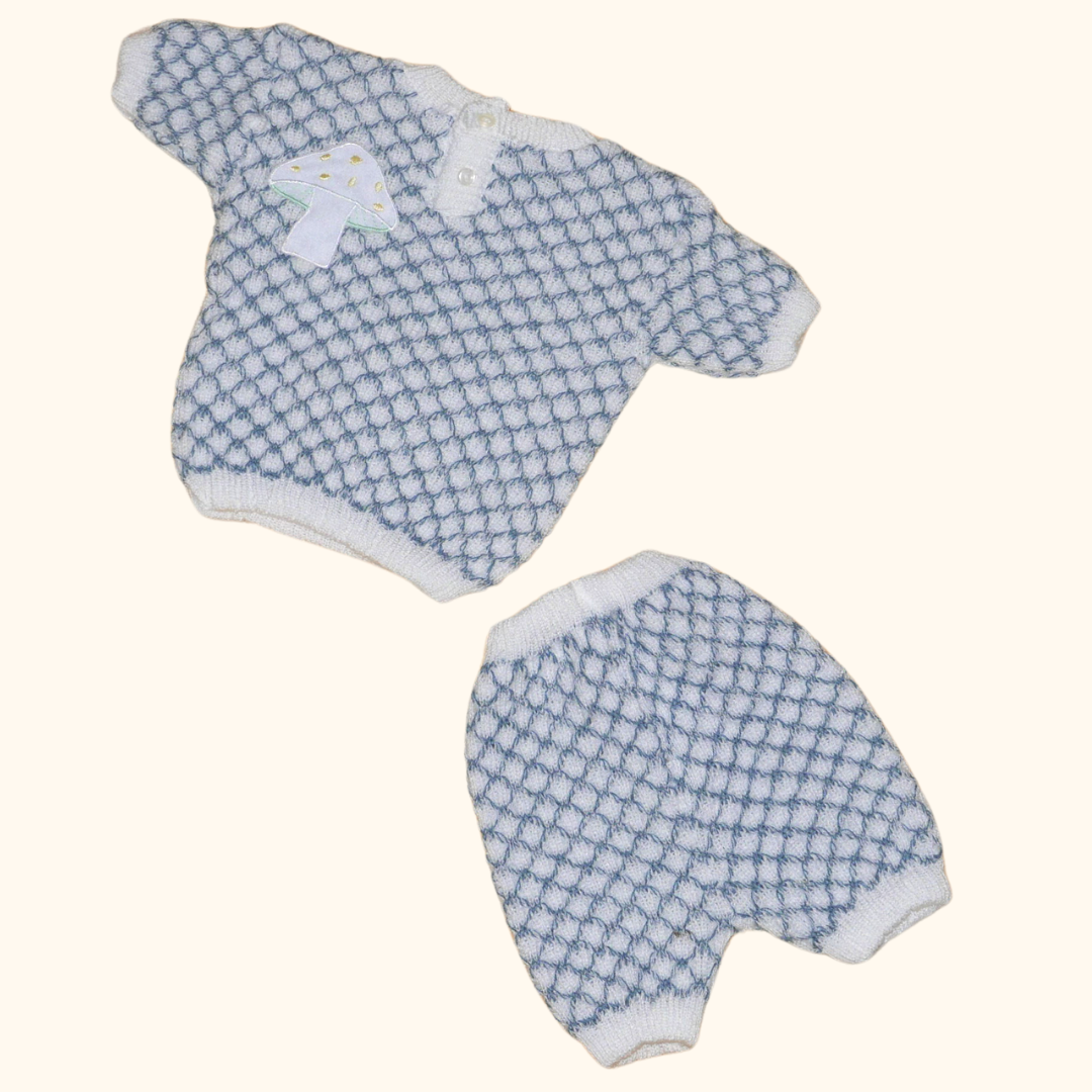 adorable baby blue mushroom set with short sleeve sweater and bloomers. sweater has two buttons and bloomers are elasticized at the waist.