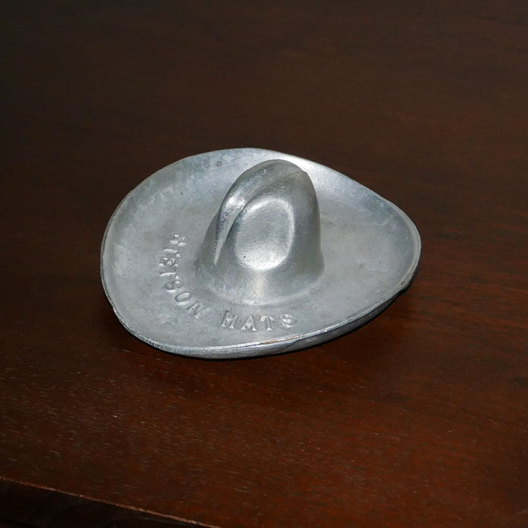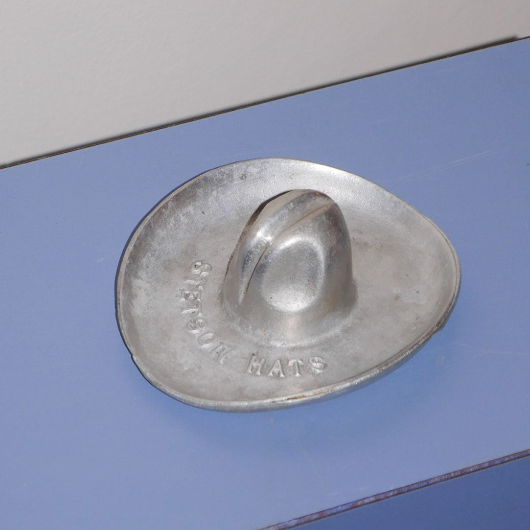 this stetson ashtray is nearly an exact replica of their infamous hats worn by cowboys and ranchers alike, since 1865. solid metal, age is consistent with age and use. embossed with "stetson hats" along the front brim.