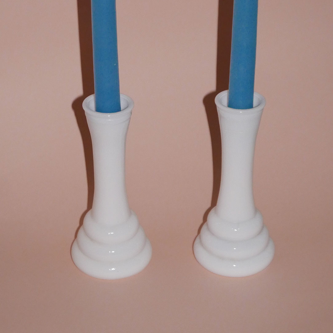 pair of small milk glass candle holder/bud vases with a rounded base.