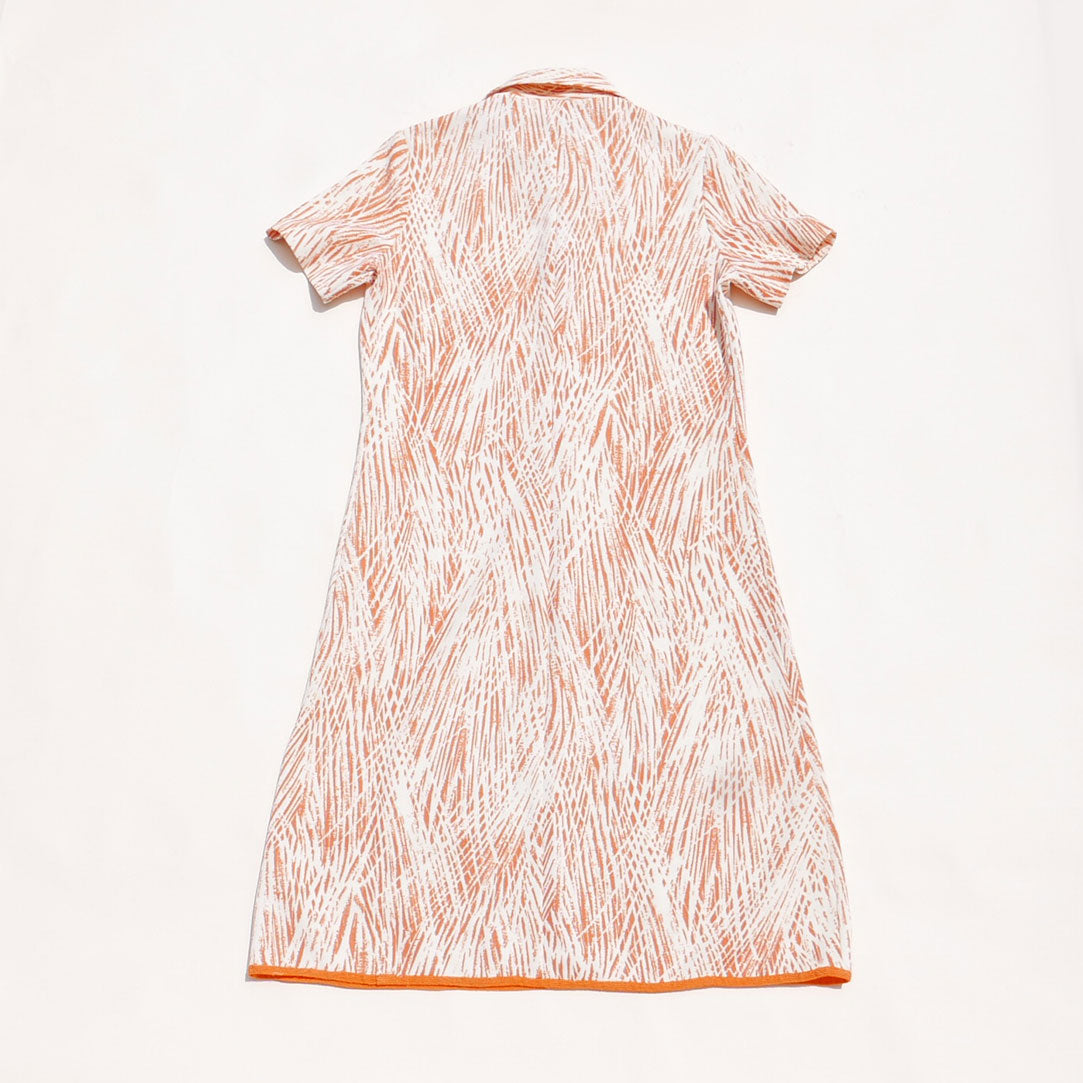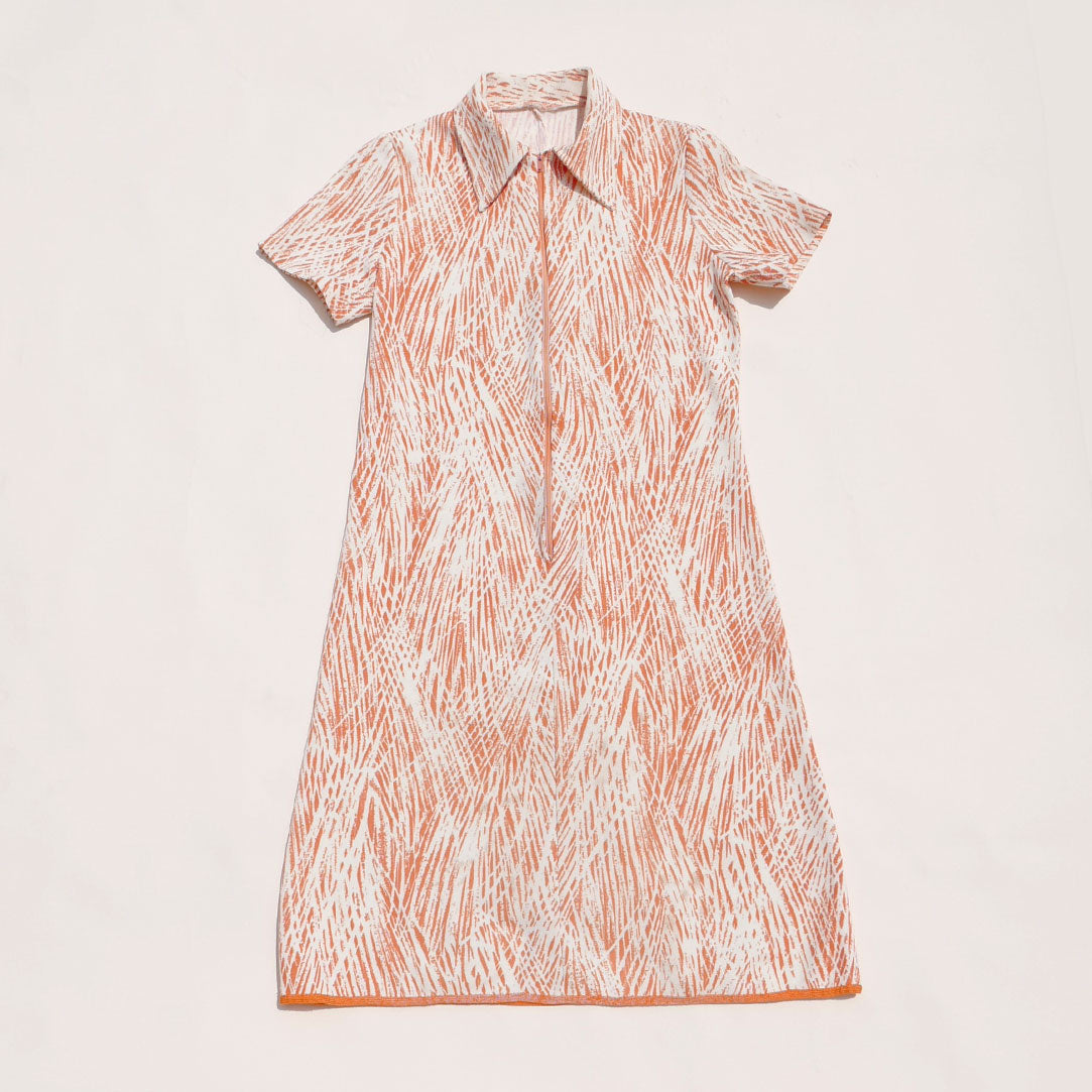 amazing retro orange printed dress with large 70s collar. front zip 100% polyester fits size s