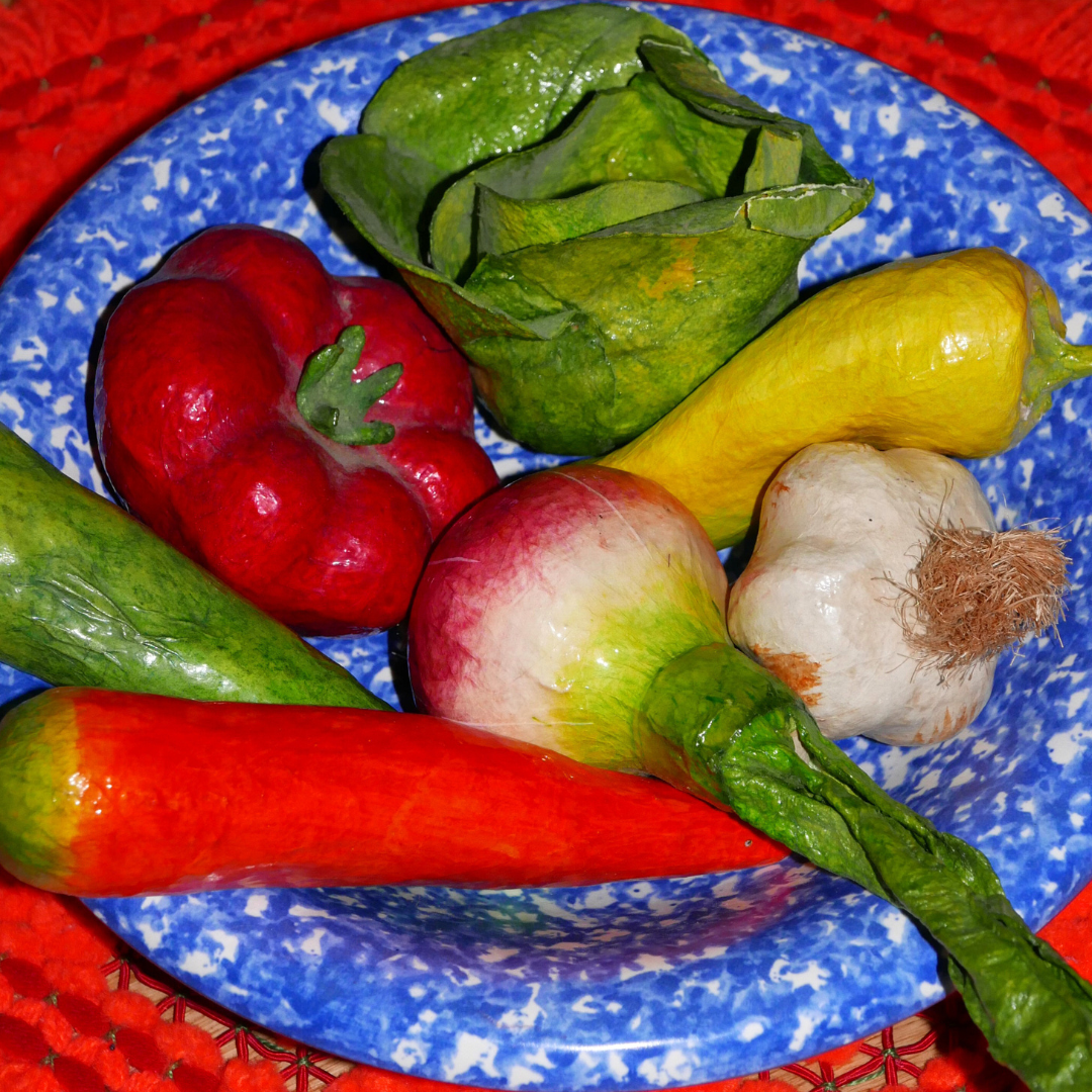 adorable set of life-sized vegetables crafted from vibrantly-colored papier maché. includes cabbage, onion, garlic, tomato, yellow pepper, green pepper and carrot.