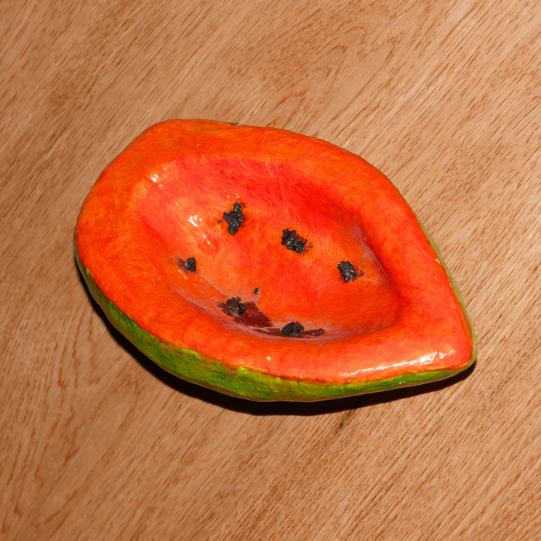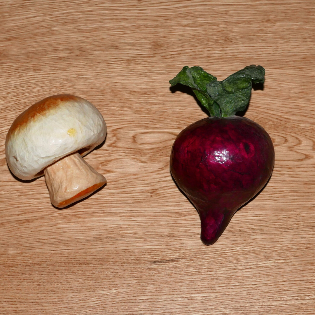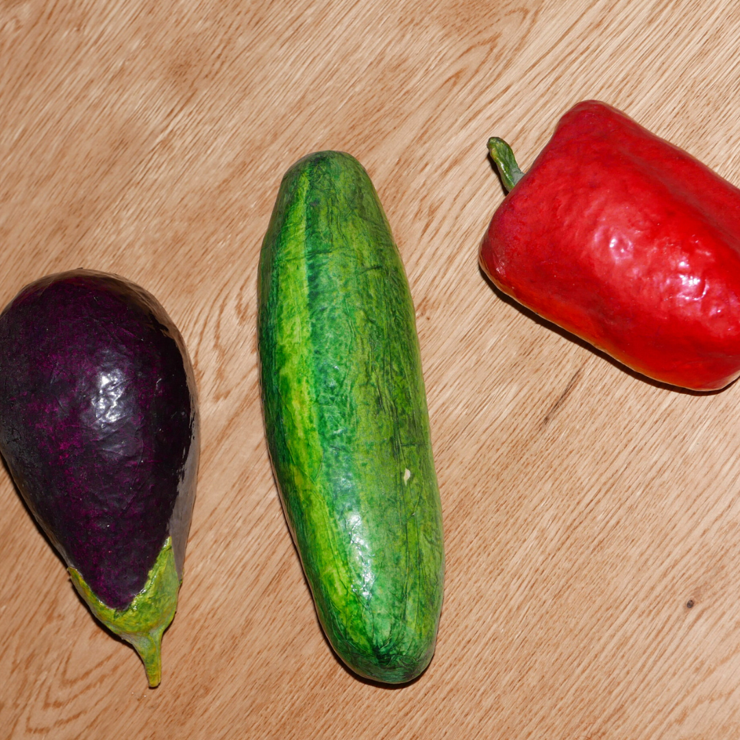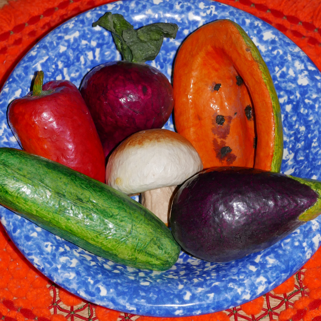 adorable set of life-sized fruit and vegetables crafted from vibrantly-colored papier maché. includes red pepper, papayas, mushroom, beet, cucumber, and eggplant.