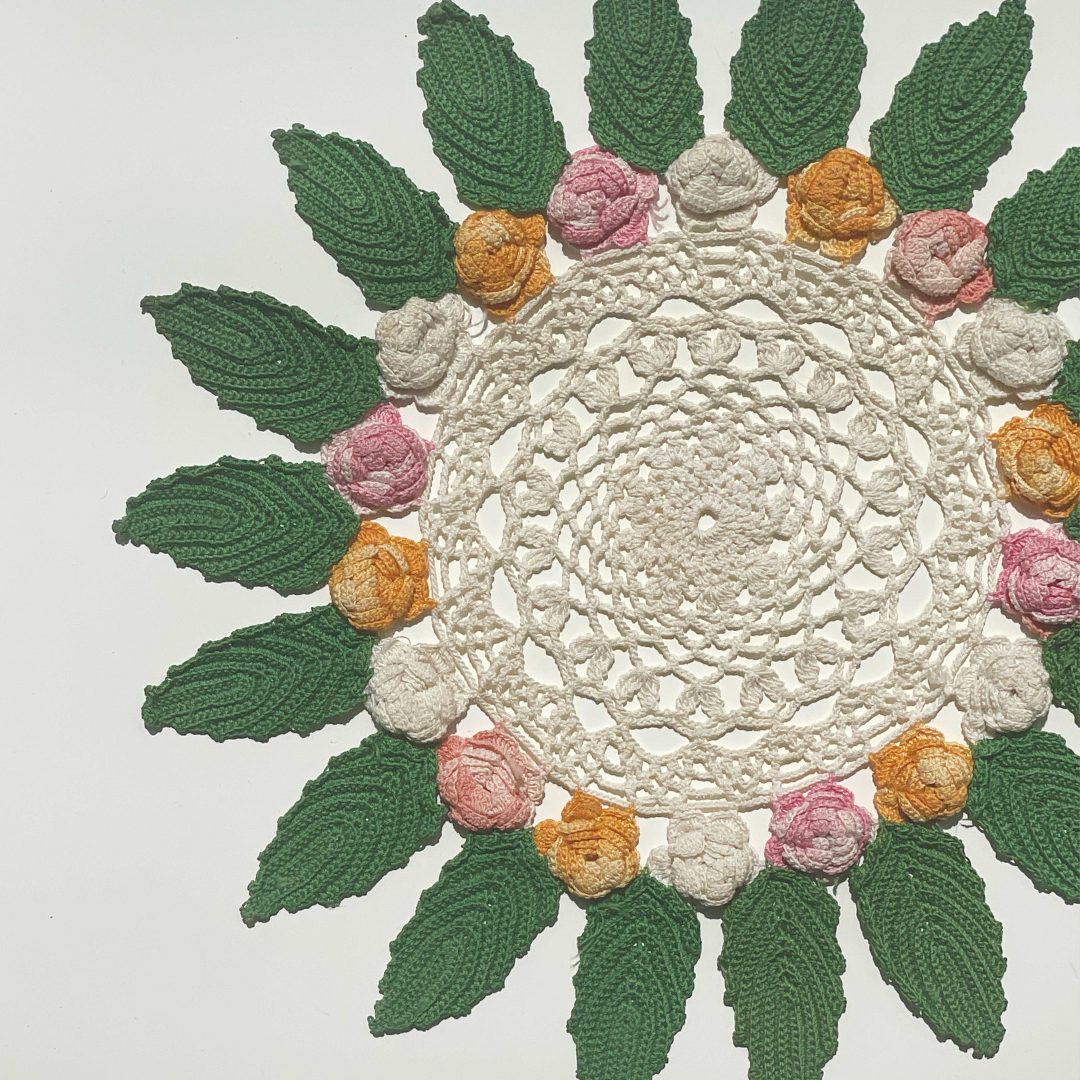 handmade crochet doily adorned with pink, cream and orange roses. perfect for showcasing your favourite vase or object.
