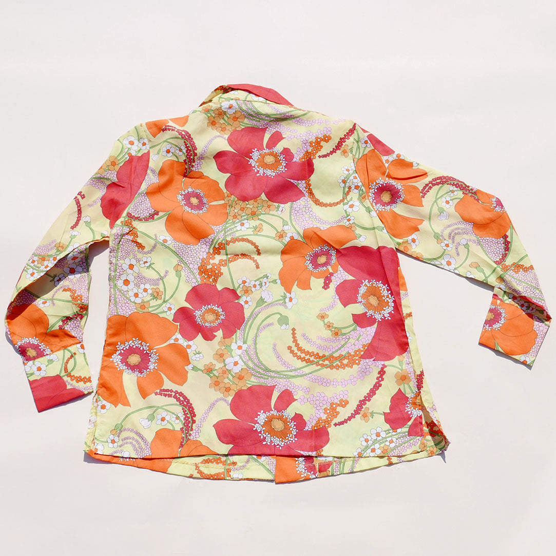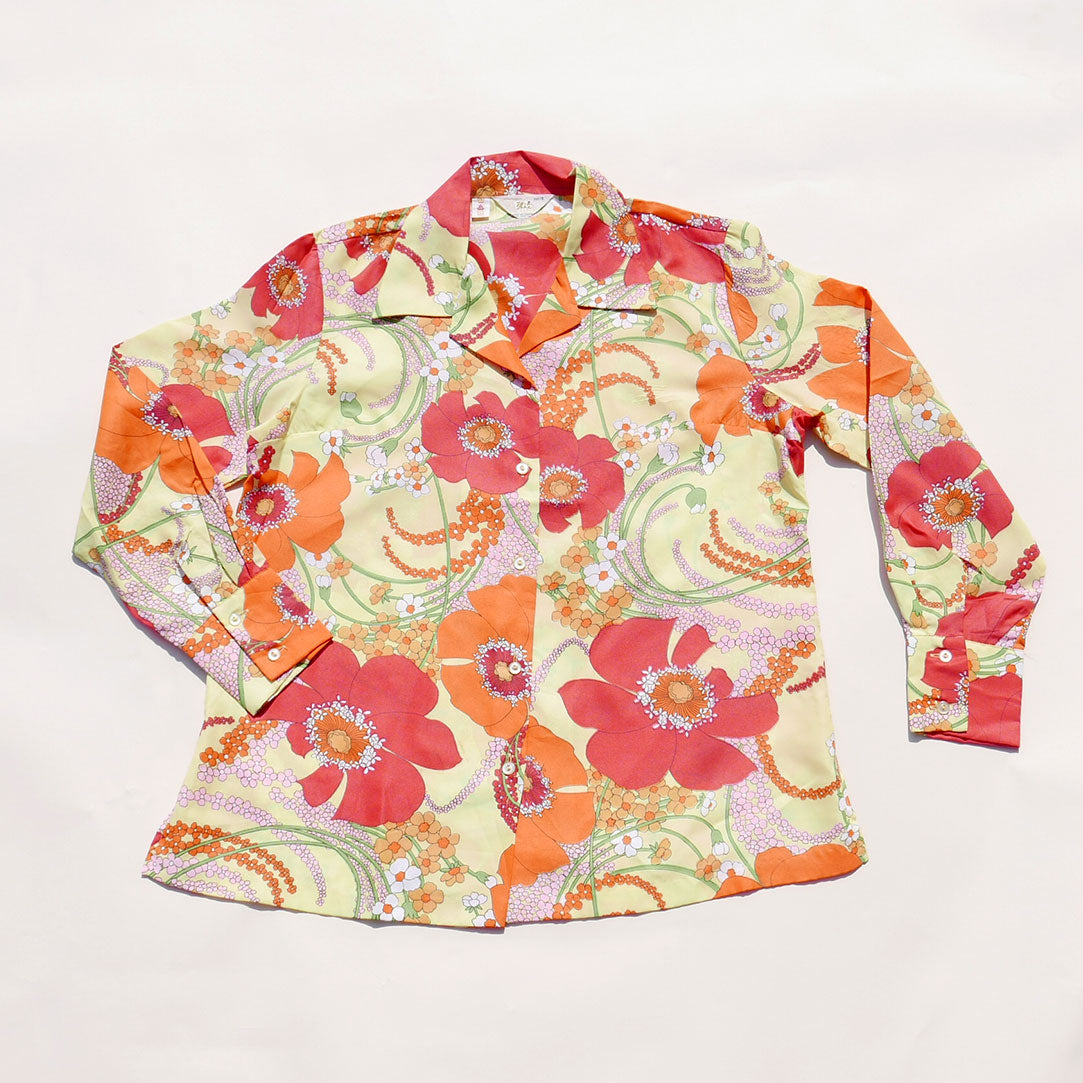 citrus coloured floral blouse circa 1970s marked size 18 fits m/l 100% polyester