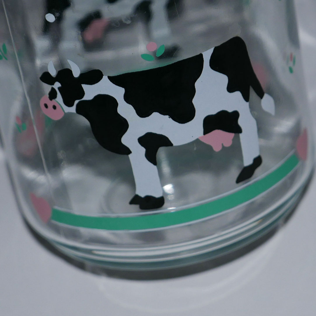 carafe pitcher with cows and flowers motif. stamped 1988.