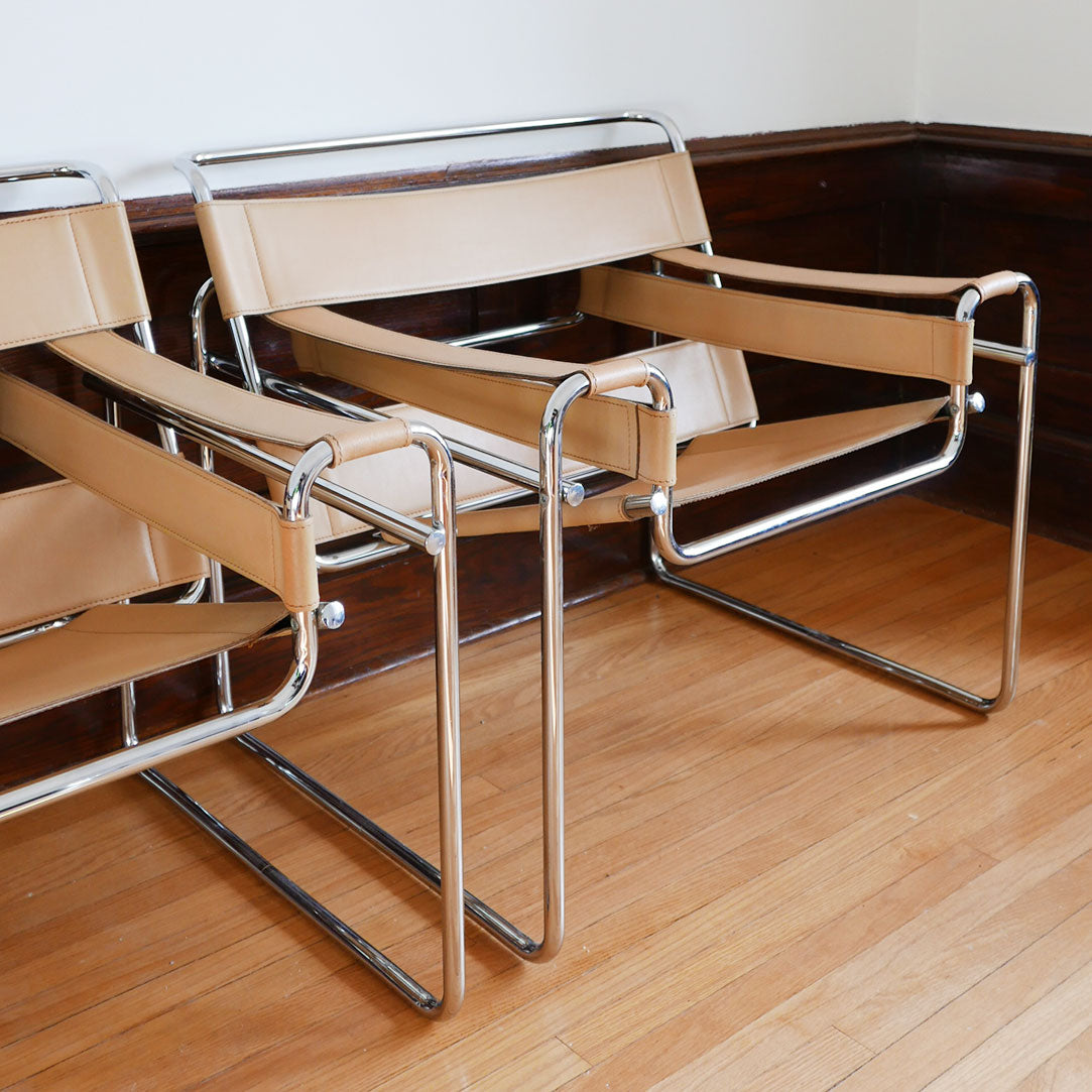 tan leather straps, tubular chrome frame. in good vintage condition, some marks and wear consistent with age and use. price is per chair!